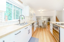 Discover this beautifully updated split-level home in Brookswood Area, showcasing a striking white-on-black design. Enjoy new vinyl siding and energy-efficient double-pane windows throughout.Inside, the spacious living area features updated engineered flooring and a cozy fireplace. The chef’s kitchen boasts butcher block countertops, stainless steel appliances, and soft-close cabinets with slide-out drawers. The updated laundry room, with stylish mosaic floor coverings, seamlessly connects to the expansive outdoor space. Step outside to over 350 square feet of deck, perfect for entertaining and enjoying the landscaped yard and BBQ area wired for TV. With two gas fireplaces, an AC Honeywell home system, and a double car garage, this home combines modern comfort with inviting charm.