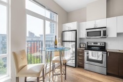 Top Floor 1-Bedroom with soaring 10ft ceilings & fresh upgrades! South-facing unit with floor-to-ceiling windows that fill the space with tonnes of natural light. Freshly updated with new vinyl plank flooring and paint throughout. Enjoy a peaceful view of the quiet courtyard from your living space. Amenities include a gym, courtyard with a kids' play area, and bike storage. 1 parking & 1 locker, EV -ready building & pet-friendly. Prime location with local businesses right at your doorstep. Just a 9-minute walk to Gateway SkyTrain Station for fast access to SFU, Central City Mall, parks, and more!