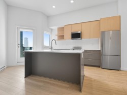 Penthouse!! 11 feet ceiling 1-Bedroom in Q5 – Designed for Contemporary Living. Welcome to your new home at Q5, a vibrant and meticulously planned community where comfort meets convenience. This brand-new 1-bedroom unit features 8-foot ceilings and expansive windows, creating a bright and airy ambiance throughout. The designer kitchen is a standout, boasting stainless steel appliances, quartz countertops, LED flush-mount lighting, and a stylish blend of wood grain and solid color cabinetry. Wide plank flooring and soaring ceilings elevate the modern aesthetic, sleek and sophisticated living space. Residents enjoy a comprehensive range of amenities, including: EV pre-wired parking, gym and yoga room, cozy fireside lounge, community gardens and close George Skytrain Station Parking & Storage