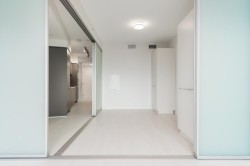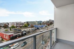 This 483sf studio + den features a unique architectural design with two sets of sliding frosted glass doors that allow the sleeping area to blend seamlessly with the living space. The balcony offers unobstructed views of False Creek flats and the North Shore mountains. The sleek kitchen includes matte laminate cabinets, integrated fridge and dishwasher, built-in oven, induction cooktop, quartz countertops, and a Kohler under-mount sink. The sleeping area offers modular storage, while the elegant 4-piece bathroom features Kohler fixtures, porcelain tiles, a dual flush wall-hung toilet, mirrored cabinet, and a soaker tub. The flex room is ideal for storage or a home office. Air conditioning is individually metered.