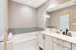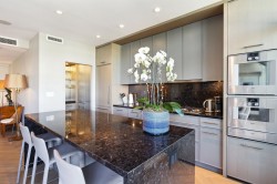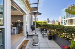 Experience elevated indoor-outdoor living at The Crane. This renovated sanctuary features a gourmet kitchen with Gaggenau/Subzero appliances, custom cabinetry, granite counters, and a wine fridge. A garage-style door opens to 300+ sq ft of patio space. Inside, herringbone oak floors and a Murphy bed offer style and flexibility. The second bath includes a steam shower, while the spacious primary boasts a marble fireplace and spa-like ensuite with soaker tub and marble finishes. The 600+ sq ft rooftop patio offers stunning North Shore and downtown views.