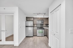 A rare find & incredible value in this top-floor retreat! This bright, south-facing corner suite welcomes you with space, light & modern comfort from the moment you arrive. Nearly 700 sqft of stylish living features ss appliances, stone countertops, new flooring & a sleek glass-tiled backsplash. Beautiful French doors open to a flexible den, ideal for a home office or creative space, while a large skylight fills the kitchen, living & entryway with natural light. Enjoy a private patio overlooking Shelley Park, quietly around the corner from the vibrant energy of Commercial Drive's cafés, restaurants, shopping & SkyTrain access all at your doorstep. Generous in-suite storage, secure parking & bike locker, this standout opportunity priced below assessed value.