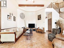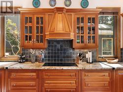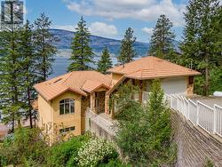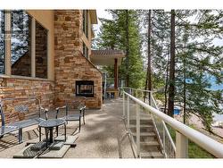 Custom Lakeshore Retreat on a Quiet Bay Nestled in a tranquil bay, this custom lakeshore home blends luxury, privacy, and natural beauty. Set on a coarse granite sand beach, it offers an exceptional waterfront lifestyle with added seclusion from adjacent undeveloped shoreline. The main floor is designed for open-concept living and entertaining, with soaring vaulted ceilings and a striking two-story layout. A grand rock wood-burning fireplace anchors the space and separates the main living area from the private master suite. Expansive windows frame breathtaking lake views that fills the home with natural light. The chef’s kitchen features granite countertops, a large custom island, high-end cabinetry, and a generous walk-in pantry. A spacious dining area seats ten comfortably. A dedicated wine cellar adds to the home’s appeal. At the rear, a large recreation area with coffered ceilings is accessible from three sides—perfect for gatherings or relaxing family time. The home is roughed in for a future elevator, with a designated chase starting in the garage. Multiple decks and a two-sided outdoor fireplace provide year-round enjoyment and stunning views. Set on a low-maintenance lot with native vegetation, this home is designed for easy living. Enjoy the panoramic lake views, natural surroundings, and direct access to a shared dock. Furniture negotiable. Tile looking metal roof A true lakeside retreat—crafted for comfort, style, and lasting memories. (id:27)