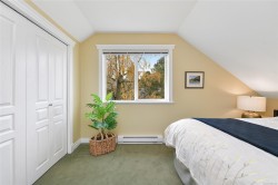Exuding timeless elegance, refined craftsmanship, this exceptional 2-level, 2-bed, 2-bath TOWNHOUSE is a hidden gem nestled within a quaint 3-unit heritage-style building that was rebuilt in 2000. Over 1,200sf of curated living space, this home harmoniously blends historical charm with modern convenience. The meticulously designed open concept layout showcases gourmet kitchen, inviting living area with cozy gas FP and stunning hardwood floors bathed in natural light from numerous windows & skylights. With 9-foot ceilings, wood-trimmed windows, stained glass accents, every detail reflects a bygone era of quality and sophistication. Step outside to your own lush front yard and relax on the expansive veranda, soaking in the ambiance of this lovingly maintained abode and in the warmth of SW sunshine. Experience the allure of townhouse living with the intimacy of a boutique community in a prime location just moments from Downtown and the vibrant Fernwood Village.