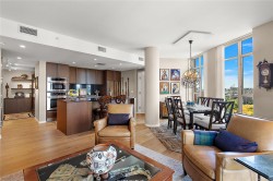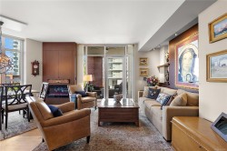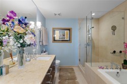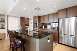 Discover sophisticated urban living at Bayview One in this 1,538 sq ft, 3-bedroom, 3-bath residence featuring Kentwood engineered floors and custom Wenge cabinetry throughout. Two spacious primary suites include walk-in closets with custom organizers and spa-inspired ensuites. A custom office nook with water views and a library wall with lighted display cabinets add both function and style. The gourmet kitchen is equipped with Jenn-Air, Bosch, and DCS appliances, plus a built-in Miele coffee station and wine fridge. The living room offers illuminated shelving and a Napoleon linear fireplace with a hidden TV cabinet. An oversized storage unit is conveniently located next to the parking stall. Building amenities include concierge service, a fitness centre, steam rooms, a whirlpool, a lounge with billiards, and an outdoor terrace with BBQs. Just a short walk to downtown and the Songhees Waterway, this pet-friendly home welcomes two companions.