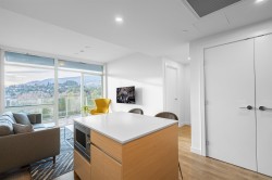 Breathtaking Views in West Vancouver. Enjoy panoramic views of the North Shore Mountains, ocean, and Lions Gate Bridge from this stunning 1-bedroom, 1-bathroom west-facing home in The Sentinel. Designed for luxury living, this immaculate unit features a spacious balcony, soaring 9-ft ceilings, floor-to-ceiling windows, and A/C for year-round comfort. The gourmet kitchen is perfect for entertaining, with a sleek island, high-end AEG appliances, a gas range, and quartz countertops and backsplash. Residents enjoy resort-style amenities, including a concierge, party lounge, fitness center, sauna, steam room, hot tub, yoga studio, outdoor lounge, and three guest suites. Owner-occupied and in excellent condition!
