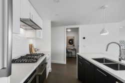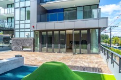 Brand new home exudes elegance and sophistication in the bustling heart of White Rock. This south- west corner 975 sf, 2 bdrm + den, 2 bath residence, with expansive 433 sf wrap-around balcony, boasts breathtaking 11th floor panoramic ocean and Gulf Island views. It showcases bright, open layouts, over-height ceilings, elegant finishes, air-conditioning and custom roller blinds. The modern kitchen features sleek, soft-close cabinetry, panelled Bosch stainless steel appliance package and a polished quartz, waterfall edge island, complemented by a contemporary color scheme and warm under-cabinet lighting. King-sized master bedroom has ensuite with quartz countertops, dual sinks and Grohe plumbing fixtures. Includes gas hook-up for BBQ, an EV-ready parking stall and storage locker.