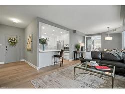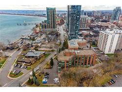 Location, Location! Within steps of Burlington’s vibrant downtown, 2121 Lakeshore Road — “Village Gate” — stands as an exclusive boutique condominium. Welcome to Unit 603, a distinguished corner suite where luxury, light and views define every room. Featuring 9' ceilings, expansive windows, and beautifully scaled principal rooms, this residence blends contemporary elegance with soft, refined décor. Every detail has been thoughtfully curated to offer a serene, elevated living experience. The open-concept Living & Dining Room is ideal for both lavish entertaining & intimate evenings at home. A separate Den provides a tranquil space to unwind while taking in the view. The custom Kitchen showcases white cabinetry, quartz surfaces, a breakfast bar, glass tile backsplash, LED pot lights, & stainless steel appliances. Tucked away from the main living area, the Bedroom Wing offers discretion & calm. A charming Hall Library welcomes you into the private quarters. The Principal Bedroom Retreat impresses with a cozy sitting area framed by a bay window, custom walk-in closet, a spa-inspired 3-piece Ensuite featuring heated tile floors, vanity w/quartz counters, step-in shower & linen closet. A spacious Second Bedroom, also highlighted by its own bay window & stunning views, ensures guests enjoy comfort & style. The Main Bath mirrors the luxe finishes of the ensuite w/heated flooring, white cabinetry, quartz counters & a step-in shower. Additional Appointments: In-suite Laundry w/ stacked washer/dryer & storage. Engineered hardwood floors; custom blinds; tall interior doors; closets w/custom organizers, two linen closets. Two Parking Spaces. Locker. The building offers FOB-secured lobby access, elevators & visitor parking. Unmatched Downtown lifestyle: cafés, boutiques, Performing Arts Centre, fine dining, Art Gallery, Waterfront Trail, plus nearby hospital, transit, recreation, shopping & major highways. Unit 603 at 2121 Lakeshore Road — “Honey, I’m Home.”