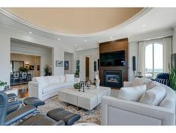 UNCOMPROMISING LUXURY IN DOWNTOWN BURLINGTON - This one-of-a-kind penthouse in an exclusive 13-suite boutique condominium offers 3,017 sq ft of refined living, with four private terraces - each showcasing panoramic views of Lake Ontario and downtown Burlington. Flooded with natural light, the residence features soaring 11-ft ceilings, hardwood and marble floors, and an integrated Bang & Olufsen sound system throughout. Enter through grand double doors into a marble foyer that opens into a spectacular Great Room with a dramatic 21-ft domed ceiling, crystal chandelier, gas fireplace, and walkout to a stunning 30' x 9' terrace. The chefs kitchen is appointed with built-in Miele appliances, custom cabinetry, and island seating, with direct access to a terrace equipped with a natural gas BBQ. A separate formal dining room with elegant chandelier and detailed ceiling mouldings enhances the condos timeless appeal. The first bedroom includes a walk-in closet, 2-piece ensuite, intricate ceiling mouldings, and access to a private terrace ideal as a guest suite, lounge, or office. Down the hall, a second bedroom features a statement chandelier, adjacent laundry room, and access to a designer 4-piece bath with soaker tub. The primary suite is a serene retreat, offering dual walk-in closets, a spa-inspired bath with oversized glass shower and private water closet, a lounge nook perfect for reading or working, and its own private terrace. Includes 2 underground parking spaces and a storage locker. An exceptional alternative to a large home - ideal for those seeking space, privacy, and refined urban living. Just steps to fine dining, boutique shopping, the Performing Arts Centre, Spencer Smith Park, and close to the QEW, 403, 407, and GO. NOTE: Dogs are not permitted.