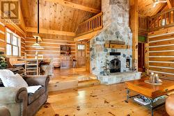 Set on 6.69 forested acres with over 1,400 feet of private shoreline, this custom-built log home on Palmerston Lake offers quiet comfort and quality craftsmanship. The setting is both peaceful and wild, bordered by more than 1,000 acres of Crown land and over a kilometre of untouched Crown shoreline to the west. A short boat ride from the Marina brings you to the dock, where deep, clean water invites you to swim, fish, or simply take in the long, uninterrupted views down the lake. Designed with care and built to last, the home features timberframe accents, wide-plank pine floors, and a soaring great room anchored by a striking fieldstone fireplace. A woodstove adds warmth to the lower-level family room, while three bedrooms and two full baths provide space for family and guests. Down a forest path, a separate bunkie with its own outhouse offers a quiet retreat for visitors or a distraction-free artist's studio. The off-grid systems are robust, with a large solar and battery setup, generator backup, lake water intake, and full septic. Outside, a large firepit near the waters edge offers the perfect way to enjoy starlit evenings, and trails through to the neighbouring Crown land offer easy access to ATV and snowmobile routes. Imagine sipping your morning coffee on the dock as loons call across the water, grounding you in the quiet beauty of the land. 1.5 hours from Ottawa or Kingston, this is a place to get away and settle into a slower rhythm. (id:27)
