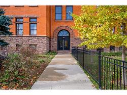Discover a truly distinctive opportunity at the historic Stinson Lofts, where old-world character and modern comfort converge. This rare main-floor corner unit offers exceptional value for its generous square footage, highlighted by a remarkable 28' x 12' private patio with sweeping views of the community playground and the lush Hamilton escarpment. Inside, soaring ceilings, exposed brick walls, and rich hardwood floors preserve the timeless charm of the 1894 Stinson School, while an airy open-concept design provides a bright and inviting flow. The stylish kitchen features quartz counters with a breakfast bar, stainless steel appliances, and in-suite laundry, seamlessly opening to spacious living and dining areas ideal for entertaining. This unique layout features 2 primary suites, the first with dual closets and a modern three-piece bath. The second private suite has it's own entrance off the dining area through french doors, with a large versatile accessway that is perfect for an office or extra storage. Believed to have once been the kindergarten classrooms of the original school, this spacious suite includes built-in shelving and a fall bathroom. It's time to move into this one-of-a-kind residence that offers a rare blend of heritage elegance, modern functionality, and unbeatable value. Includes one exclusive parking spot, P21.