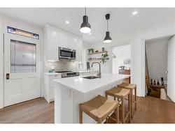 This charming brick century row house perfectly combines historic character with modern upgrades, including a newly renovated kitchen, updated electrical and plumbing, a 2018 furnace, and a new air conditioning system. This 5-bedroom, 2-bathroom 1549sqft home is tastefully maintained throughout, with original hardwood floors, high ceilings, and elegant finishes like stained glass, and Victorian transom windows. The home offers move-in ready comfort while being ideally situated near schools, a fenced-in backyard with trees and a large gate opening for parking. Steps from the vibrant James St. North, close to cafes, restaurants, and parks, this home is a rare opportunity to enjoy both the city's rich history and contemporary conveniences in one exceptional property.
