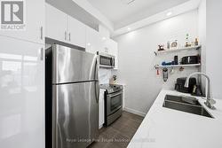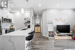 Penthouse perfection at Sapphire Condos. This beautifully upgraded top-floor residence offers incredible value, modern finishes, and custom touches throughout. Take in breathtaking west, north, and lake views from your private balcony, overlooking peaceful water and ravine landscapes while enjoying stunning sunsets. Inside, the suite features a sleek kitchen with quartz countertops, a waterfall quartz island, upgraded slide-in range, custom cabinetry, designer lighting and pot lights. Warm laminate flooring flows through the living room and bedroom, complemented by luxury vinyl plank in the kitchen and foyer. Three custom feature walls elevate the space - one in the living room, kitchen and the bedroom adding character and uniqueness. The primary bedroom includes a spacious walk-in closet, and the large bathroom features a stacked washer and dryer. Located in one of Stoney Creek's most desirable waterfront communities, this penthouse is surrounded by scenic walking and biking trails, wine-country experiences, and everything the region offers. Minutes to Niagara Falls, Hamilton, Toronto, the coming GO Train, all major highways, Costco, medical centers and grocery stores. Undeniable value. (id:27)
