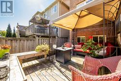 Welcome to your dream home in Waterdown! Perfectly placed in one of Waterdowns most sought-after neighbourhoods, this meticulously maintained corner end-unit freehold townhome offers approximately 2,900 sq. ft. of total living space (2,049 sq. ft. above ground), including 3 spacious bdrms Plus Den and 4 washrooms With modern updates, thoughtful design, and an abundance of natural light, this home combines comfort and lifestyle in a highly desirable setting. *The main floor showcases 9 Feet Ceiling, new hardwood flooring, a separate dining and living area with 2 Way fireplace, and a chef-inspired kitchen with extended cabinetry, a centre island with raised breakfast bar, granite countertops and Eat- in- kitchen area, California Shutters. Step outside to enjoy a two-tier deck featuring a beautiful gazebo with custom built-in bench, all surrounded by lush greenery perfect for hosting! Entrance from Garage to Home. *Upstairs, the versatile loft/office is perfect for working from home, primary suite features 2 closets with one walk in closet, a luxurious En-ensuite complete with a oversized jacuzzi spa tub, glass shower, and granite vanity. 2 more generous size bdrms with windows overlooking the backyard and one full bathroom with soaker Tub. New carpet throughout the stairs and second floor. Recently renovated W/O balcony Newer Windows in the bdrms *The fully finished bsmt offers even more living space with new cork flooring , Pot lights, a den, ample storage, a washroom, and a cozy fireplace set against a beautiful stone wall makes this level is as functional as it is stylish.Set in a quiet family-friendly neighbourhood on a cul-de-sac, this home is steps from one of the best schools, day Care, the YMCA, Memorial Park, and everyday amenities, with easy access to scenic walking trails, golf courses, and the Greenbelt countryside. Commuters will love being just 10 minutes to Aldershot GO Station and Highways 403, 407, and the QEW. Best rated restaurants in the area. (id:27)