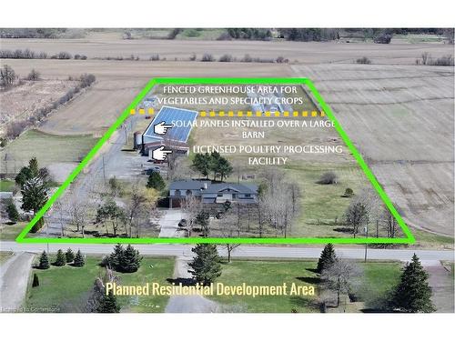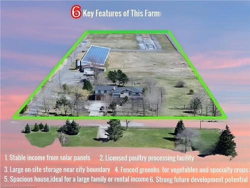 Rare 7-Acre Income-Generating Farm — Future Urban Edge of Hamilton!Incredible opportunity to own a revenue-producing farm just steps from Hamilton’s urban expansion zone — With the possibility of city sewer and water services being installed soon! Perfect for investors, entrepreneurs, or anyone seeking a self-sustaining property with major upside.Land & Buildings:• 7 Acres | 3,700 ft² 4-Bedroom Home | 9,250 ft² Barn | 150kW Solar Roof Project• Dual driveways and ample parking.Multiple Income Streams:A. Greenhouse Operation: 7 greenhouse permits (1 built, 2 foundations ready), fenced zone with year-round asphalt driveways, all structural components includedB. Chicken Processing Facility: 2,000 ft² licensed processing area, TRQ-eligible under CUSMA/WTO/TPP, ~$100,000/year income potentialC. Solar Energy: FIT1 project generating ~$125,000/year at $0.713/kWh, contract secured until Oct 2035 — 10.5 years of guaranteed incomeD. Additional Rental Income: 7,000 ft² of indoor storage space inside the barn — perfect for leasing to farm businesses or storage needs.The Home:Spacious 4 Bedrooms | 2.5 Baths | 2 Kitchens (ideal for multi-gen living or farm staff), antique marble fireplace, hardwood/tile floors, bonus room above garage, new roof (2024). Water & Utilities:City water delivery (cistern), septic system, and two 50-ft deep wells (house irrigation + barn automation).Future Growth:Located directly along Hamilton’s official expansion boundary — ready for major appreciation as urban development moves closer.? Bonus:The senior and experienced owner is willing to fully train the new buyer in all aspects of the business and property management — hoping to pass on his legacy and see this thriving operation grow even stronger.Ideal for: Investors, commercial farmers, poultry processors, greenhouse operators, and lifestyle buyers seeking a rare blend of income and long-term growth.