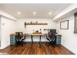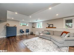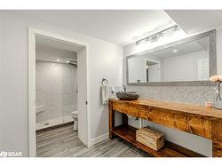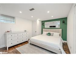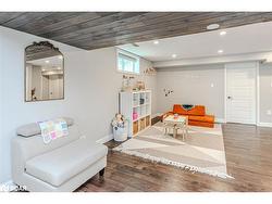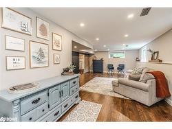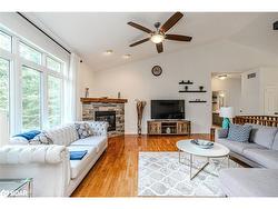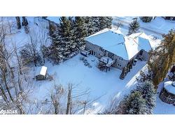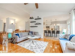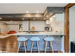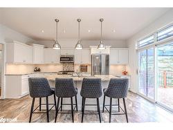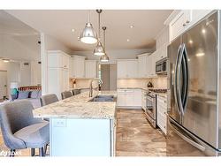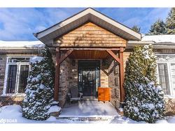 SOPHISTICATED HORSESHOE VALLEY RETREAT WITH OVER 3,750 FIN SQ FT, IN-LAW POTENTIAL, TRIPLE CAR GARAGE & PRIVATE LOT! Prestigious Horseshoe Valley living awaits in this extraordinary bungalow, steps from Horseshoe Resort and only minutes from golf courses, trails, tennis courts, and Vetta Nordic Spa. From the moment you arrive, the elegance is undeniable, with a brick exterior, updated shingles (2022), a covered porch featuring wood posts and beams, a triple-car garage with inside entry, and a driveway with parking for nine vehicles. The property itself is a private retreat, showcasing mature trees, manicured gardens, a patio with a pergola, a hot tub, a fire pit, a shed, and invisible dog fencing. Over 3,750 fin sq ft of exquisite living space is defined by hardwood floors, 14-ft ceilings, and open-concept principal rooms. The gourmet kitchen features white cabinetry topped with crown, stone countertops, an island with a sink, a bar area with a second sink and a beverage fridge, stainless steel appliances including a gas stove, and a walkout to the raised deck. A formal dining room enhances the hosting experience, while the living room is anchored by a stone-surround fireplace with a wood mantle. The primary suite is complete with a walk-in closet and a lavish 5-piece semi-ensuite presenting heated floors, dual sinks, and a glass-door walk-in shower with a bench. The impressive walkout basement continues to amaze with engineered hardwood floors, a double garden door walkout, expansive windows, pot lights, and a second kitchen with an electric induction cooktop, breakfast bar, and tile backsplash. Two additional bedrooms plus a den, a 4-piece bathroom with heated floors, and a massive recreation room create endless opportunities for family living or entertaining. The home also comes equipped with central vac. Designed for memorable gatherings, quiet moments, and everything in between, this Horseshoe Valley retreat is ready to be your forever #HomeToStay!