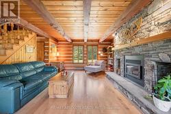 Charming log home on 1.99 acres in Braeside offering 3 bedrooms, 2.5 bathrooms, a versatile bonus room above the garage, a large barn, and a lean-to, with a balance of mature trees and cleared space; enter through a foyer with coat closet leading to a spacious living room with wood-burning stove, newly updated kitchen with ample cabinetry, quartz counters, large island with bar seating for four, pot and pan drawers, undermount sink at window, and adjoining dining room with space for family table and buffet; main floor powder room; upstairs features a primary bedroom with ample closet space and ensuite with vanity, toilet, and tub/shower with ceramic surround plus additional closet space; two secondary bedrooms with ample closets share a full bathroom with tub/shower, ceramic surround and toilet, which also connects to a laundry room with utility sink and storage; the bonus room above the garage provides flexibility for a family room, home office, hobby space or extra bedroom with inside access to the garage; finished basement includes a large family room with wood stove, bar area, and storage/utility room; wood heat throughout creates a cozy ambiance; outside enjoy the barn, lean-to, and generous acreage offering privacy and endless possibilities. 24hrs irrevocable on all offers. (id:27)
