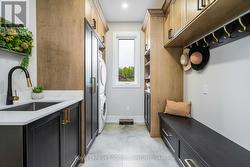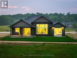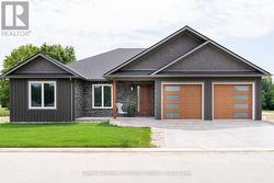 Experience the charm of a unique floor plan that makes this golf course bungalow both welcoming and exceptional. With over 2,200 square feet of thoughtfully designed living space, the home feels even more expansive thanks to its spacious front entrance and breathtaking great room. A stunning 14-foot-high stone feature wall anchors the open-concept living area, complemented by an elegant linear fireplace that adds warmth and drama. Many of the design details have been carefully curated by an interior designer to create a warm, earthy palette, featuring two-tone kitchen cabinetry, white oak flooring, and Benjamin Moore paint throughout. Stylish, modern lighting selections further elevate the home's custom aesthetic. The great room opens to a covered backyard retreat -- an ideal space to relax and take in the tranquil views of the manicured greens and mature trees of the Meaford Golf Course. Solid wood, three-panel interior doors -- extra tall and painted black -- are paired with upgraded gold-tone hardware, adding a refined touch throughout. The generous primary bedroom offers sliding door access to the backyard and golf course views. Two additional bedrooms -- both bright and spacious -- share a sleek four-piece bathroom. One of these rooms is perfectly suited for use as a home office or cozy den. All bathrooms feature high-end, contemporary finishes. Skylights in the kitchen bring in additional natural light, while pot lights throughout ensure a bright and welcoming atmosphere. A custom mudroom off the garage offers practical, organized storage. The exterior showcases a striking blend of wood and cultured stone, with a stamped concrete driveway leading to modern windowed garage doors. Comfort is top of mind with hydronic in-floor heating in both the garage and lower level. (id:27)