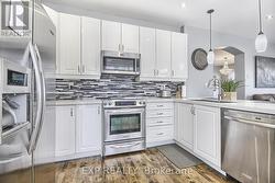 Beautiful family home - double door entrance, east facing corner house with no side walk. 9 ft ceiling on ground, Potlights (smart) throughout - indoor & outdoor, main floor seperate office, large upgraded modern kitchen with white cabinets and quartz countertop. Open concept Large family room with TV accent wall & gas fireplace. Lots of windows and natural light, whole house humidifier , 2nd floor spacious laundry, stamped concrete drive way and backyard, nest thermostat & camera. Ingrounded sprinkler system. Located minutes from major highways 401 and 407 for easy access to all areas of the GTA. Amazing location surrounded by great schools and many parks for families to enjoy. Walking distance to excellent Catholic, Public and French Immersion schools. 3 mins walk to park with splash pad and tennis court. Kids friendly quiet street. Partial Basement included with extra finished space for the 2nd office or gym. Lots of storage. Tenant will pay 70% utilities. Required - 1 year lease, credit check, employment letter, pay stub, reference check, One month deposit. ***The property is currently vacant. To provide better sense of the home's layout and appeal, prior listing photography has been utilized. (id:27)