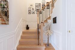 Nestled along the beautiful ravine trail system of Sawmill Valley, in the sought after gated community of Eagle Ridge, you will delight in this expansive executive two storey end-unit townhome offering over 2750sf of finished living space, with a versatile lower level perfect for family, work, or recreation. Step into a spacious foyer with a large coat closet and secondary access through the private garage. The main level is beautifully appointed with hardwood flooring throughout, complemented by crown moulding and wainscotting. The formal dining room enjoys a northwest exposure, filling the space with natural light. A bright and airy living room and breakfast area with many large windows, new blinds, gas fireplace, and walkout to back patio through sliding glass doors. Notice the conveniently located private powder room. The newly renovated kitchen is a highlight, featuring a quartz countertop, classic white cabinetry with large pot drawers and an additional sliding door to the barbecue patio. Upstairs, enjoy the new wood staircase with new spindles and railing. The primary bedroom overlooks the backyard with two large windows, spacious walk-in closet and fully renovated ensuite with glass-enclosed shower and separate vanities with storage. Two additional bedrooms offer large windows and ample closet space, with the second bedroom featuring an attractive bay window. The main 4-piece bathroom includes a tub/shower combination with a quartz-topped vanity. Upper level laundry washer and dryer is conveniently located. Additions include security guard at gate, a private recreation centre with indoor pool, hot tub, sauna, racquetball court and library. All included in your fees. (id:27)