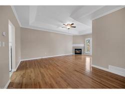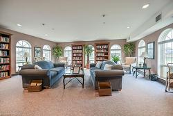 WELCOME TO TWENTY PLACE! This popular adult-lifestyle community offers a spectacular residents' clubhouse with many great amenities! Enjoy the indoor pool, sauna, whirlpool, the fully equipped gym, a library, games and craft rooms, pickle ball court, shuffleboard and lawn bowling courts, and the many social events held in the grand ball room. This is turn-key living at its best! Clean and move-in ready end unit. The main floor primary bedroom has a mobility-friendly 4 piece ensuite bathroom with a bathtub cut-out and a window. There is a convenient pocket door into the main floor laundry room where you'll find stacking washer and dryer (new in July) and access to the attached garage. Lovely hardwood floors, gas fireplace, California shutters and 10' coffered ceiling with crown moldings are featured in the great room. A patio door leads to the super private patio with no backyard neighbors. The large eat-in kitchen has ample white cabinets, a pantry, appliances included (microwave new in July) and California shutters on the large south facing window. There is conveniently located main floor powder room with a window. A large L-shaped rec room with laminate flooring, a den (was used as a bedroom), a 3 piece bathroom, and good storage space, completes the finished basement. Quick possession is available, so start packing and you'll be on your way to enjoying your new lifestyle in this friendly, active community!
