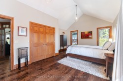 Stunning Country Estate !!! This One-of-a-Kind Masterpiece captivates from the very first glance with unmatched curb appeal and it's distinctive design. A true architectural gem, the home showcases custom exposed timber and iron construction, offering a dramatic welcome with soaring 26-foot ceilings in the foyer & great room. Anchoring the space is a striking gas stove and dramatic staircase just two of of the many bespoke touches throughout. The chefs kitchen is a showstopper in its own right, thoughtfully positioned between the great room & the expansive rear deck. Designed for seamless indoor-outdoor living, its perfect for entertaining on any scale, from intimate gatherings to grand events incorporating the sparkling heated saltwater pool, hot tub, deck, & beyond. Prepare to be awestruck yet again in the window-walled family room, where vaulted ceilings rise above a stunning floor-to-ceiling brick fireplace. Here, panoramic views of the beautifully manicured grounds, create a tranquil yet breathtaking backdrop for family gatherings. The main floor offers 2 bedrooms, including an expansive primary suite that feels like a private retreat. It features a luxurious 5-piece spa-style bath w/glass shower enclosure, a generous walk-in closet & direct access to the deck through a private walkout. Additional features include renovated 3 piece bath & laundry rm. The sweeping, open-riser circular staircase leads to the equally impressive upper level. Here you'll find two spacious bedrooms, a sleek and modern 3-piece bathroom, and a versatile loft-style den or studio area. The open-to-below wrap around balcony offers a front-row seat to the craftsmanship of the handcrafted artistry that defines this remarkable home. For the hobbyist or DIY, an incredible bonus awaits: heated 1,200 sq ft- accessory building, fully equipped with a 3-piece bathroom. This versatile space is ideal for a workshop, studio- home gym, the possibilities are endless!