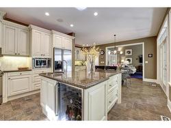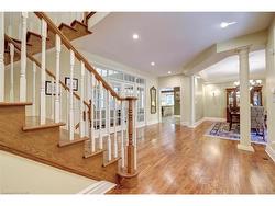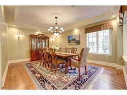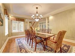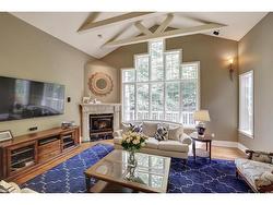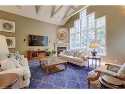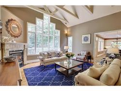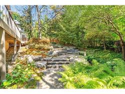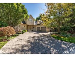 Architectural Masterpiece in Oakville - Muskoka Living on the Ravine! Welcome to the exclusive enclave of Riverbank Way, where bespoke homes overlook lush wooded ravines & back onto Sixteen Mile Creek Conservation. At the very end of this quiet cul-de-sac, the trail ends & tranquil home life begins. This custom-built 6,160 sq. ft. residence blends elegance, functionality & luxury. Sun-filled interiors are framed by picturesque forest views through expansive custom windows w/transoms. Grand living room w/soaring 16' high open-beam ceilings & gas FP forms the heart of this home. Entertain in the dining room designed for 12 guests. Enjoy Downsview kitchen featuring granite counters, marble backsplash, centre island w/2nd sink w/filtered water, gas stove, LED pot lights, B/I speakers & walk-in pantry. The breakfast room opens to a composite deck with glass railings, perfect for morning coffee, or glass of wine. The main floor primary suite boasts 10' high vaulted ceilings, FP, W/O to the deck, W/I closet & spa-inspired bath w/5-jet Jacuzzi, separate shower & stained-glass window. Convenient main floor laundry, inside garage entry & private staircase 2 LL complete this floor. Upstairs are 2 spacious bedrooms & a skylit bath. The walk-out lower level offers a separate entrance, billiards room, media room, office, 4th bedroom, large family room ideal for entertaining or multi-generational living. Granite rocks, multitier patios, lawn, stone benches in the amazing backyard. Dutch clean home. Updates: roof shingles (2018), 2nd floor hardwood (2018), finished lower-level rms (2018), furnace & AC (2023), epoxy garage flrs (2023).Lifestyle perks: miles of interconnected trails@ the doorstep, nearby Lions Valley with red cliffs, hospital, Health Science Village, new Regional Courthouse, 16 Mile Sports Complex, library, community centre, shopping, dining access Hwy 407, QEW&GO Train. The epitome of sophistication & elegance, set in Oakville's most breathtaking natural landscape.