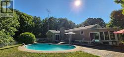 34-ACRE COUNTRY RETREAT WITH AN INGROUND POOL, IN-LAW POTENTIAL & LIMITLESS POSSIBILITIES! Set on an incredible 34-acre property surrounded by towering trees and peaceful natural beauty, this sprawling bungalow offers true country living with endless room to roam, complete with manicured trails perfect for walking, biking, or snowmobiling. Embrace a lifestyle defined by nature and tranquillity, just minutes from Georgian Bay's beautiful beaches, local parks, and a grocery store, with Wasaga Beach only 15 minutes down the road. The property makes an unforgettable first impression with a circular driveway offering parking for more than 20 vehicles, a detached double garage, multiple sheds, and plenty of space for a future shop. The expansive backyard features an inground pool surrounded by a generous patio, perfect for outdoor entertaining or quiet relaxation. Over 3,200 finished square feet, including more than 1,850 on the main level, provide an abundance of living space for families, multi-generational living, or those dreaming of a country retreat. The large kitchen features white cabinetry, built-in appliances, a centre island, and an open connection to the formal dining room, making it ideal for hosting gatherings. The bright living room overlooks the treed front yard, while the family room features a cozy wood fireplace and a walkout to the backyard. A separate sun-filled hot tub room with a fireplace offers an additional sliding door walkout leading to the pool and patio area. The finished basement extends the possibilities with in-law potential, complete with a second kitchen, living room, den, rec room, two bedrooms, and a full bathroom. Whether you envision a peaceful family haven, a multi-generational escape, or simply a property with room to grow, this exceptional #HomeToStay is filled with opportunity and ready for your personal touch to make it truly yours! (id:27)