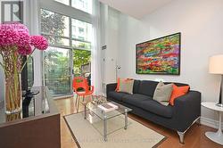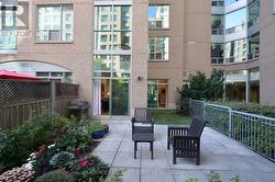 One-of-a-kind 2-storey condo with an oversized private, 550 sq ft terrace overlooking a secure, pedestrian-free courtyard. BBQ year-round in your own space. Two walkouts and 20 ft floor-to-ceiling windows flood the home with light. Living room with a view, separate dining area, open-concept kitchen with breakfast bar, built-in desk, and hardwood floors throughout the main level. Upstairs features a large open space with a king-sized primary bedroom, two closets (one partial walk-in) and a separate den space. Ideal for a professional couple. A dedicated alarm system secures the ground-floor space. Prime location: steps to St. Lawrence Market, and a short walk to Union Station, TTC, and the Financial District. Easy access to the Gardiner Expressway and DVP. *For Additional Property Details Click The Brochure Icon Below* (id:27)