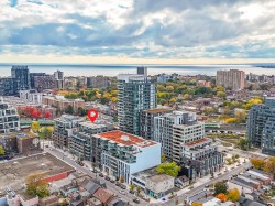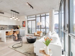 This bright, southwest-facing corner loft is a true gem in the heart of Queen West. Floor-to-ceiling windows fill the home with natural light and golden-hour warmth, framing sunset views over the tree-lined horizon and Liberty Village's heritage rooftops. The functional 850 sq. ft. layout leaves no wasted space, featuring a wide entry hallway with custom wainscoting, a split two-bedroom plan for privacy, and an open-concept kitchen, dining, and living area accented by concrete ceilings and hardwood floors throughout. Thoughtful upgrades - including quartz counters, designer lighting, new appliances, and fresh paint - add style and comfort. The second bedroom offers versatility as a home office, guest room, or kids' room, while ensuite laundry and a locker complete this thoughtfully designed suite with convenient additional storage. A gas line on the balcony makes summer entertaining effortless. Set within an intimate boutique building in one of Toronto's most dynamic neighbourhoods, you're steps from cafés, shops, and parks, and just minutes to the Ossington Strip, the waterfront, and the Gardiner Expressway. It's the perfect blend of charm and urban accessibility - peaceful, practical, and connected to everything the city has to offer, where style meets convenience. Make it yours
