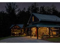 Discover the charm of this stunning century-old log cabin, beautifully set on a peaceful creekside lot. Thoughtfully renovated to blend rustic character with modern comfort, this one-of-a-kind retreat offers a warm and inviting lifestyle.The heart of the home features a custom cherry kitchen with leathered granite countertops, a live-edge wood counter in the butler’s pantry, and premium Bosch appliances (2023). Heated floors in the kitchen prep area and bathroom provide everyday luxury, while the propane fireplace (serviced May 2024) creates cozy ambiance year-round.A versatile bunkie/guest house/home office, complete with its own electric fireplace and keyless entry, expands your living or work-from-home options. Step outside to enjoy the custom timber-frame pavilion with industrial-grade heat, retractable screens, and LED lighting—perfect for entertaining or relaxing by the creek.Practical upgrades include a new water heater, pump, and water softener (2022), with the septic pumped in June 2023. The professionally landscaped 0.37-acre property features a retractable awning, dusk-to-dawn driveway lighting, and propane BBQ hook-up.With 103 ft of frontage and serene creek views, this remarkable property offers the perfect balance of character, comfort, and natural beauty. A truly rare opportunity to make a log cabin retreat your year-round home.