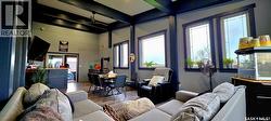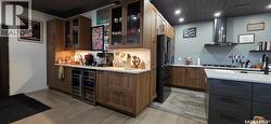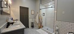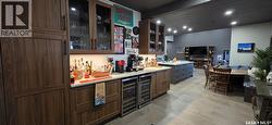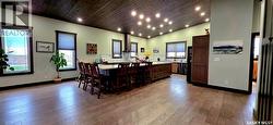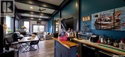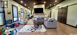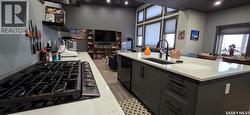 One-of-a-kind acreage located just 15 minutes from Estevan. Situated on 5 acres This 4,800 sq. ft. home offers two separate living quarters, ideal for multi-generational living, large families, or guest accommodation. The property features a total of 6 bedrooms, 4 bathrooms, and dedicated office space. Both primary bedrooms include stunning full en suite baths finished with beautiful tile flooring and tiled shower/tub accents. Interior finishes include engineered hardwood throughout the main living areas and tile in kitchens and bathrooms, stylish lighting, and wood moldings. The home is equipped with in-floor heat, high vaulted ceilings, and large windows throughout that provide excellent natural light. Each living room offers a fireplace, including one double-sided model open to a massive chef's kitchen. Additional living spaces include a cool bar/games room surrounded by windows, this space is perfect for entertaining or watching the game. Additionally there is a closed-in hot tub room overlooking the beautiful yard. The attached heated shop totals approximately 5,500 sq. ft. and is currently divided into three separate shop spaces, each with overhead door access—ideal for personal or commercial use. The shop space adjacent to the home (2200 sq ft) has an additional bathroom with laundry hookups, perfect for washing up, and a commercial grade exhaust fan so you can use your smoker year round out of the elements! The 5-acre yard site is fully manicured and serviced by multiple sprinkler zones supplied by the well. Automatic watering can be programmed from your phone for the lawn, trees, garden, raised beds, and flower areas. A detached outbuilding with concrete floor and tin siding is currently used as a chicken coop but is easily adaptable for various uses. This acreage offers exceptional space, functionality, and potential for residential or commercial needs. Must be seen to be appreciated! (id:27)