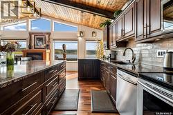 Welcome to 244 Moose Road, this expansive bungalow home is located lakefront at beautiful Crooked Lake. Built in 2012, this original owner home has over 2700sqft of living space on one level, with endless views of the lake and situated on a stunning lot. The huge double attached garage is fully insulated and heated, with plenty of room for your vehicles plus all of your necessary toys for the lake! This sprawling home offers a total of 3 bedrooms and 2 bathrooms, including a 4-season sunroom. The primary bedroom is a sanctuary, with a full 4 piece ensuite including a walk-in shower, double vanity and heated floors. Completing the primary bedroom is a large walk in closet and direct access to the sunroom. The kitchen is a chef’s dream with gorgeous cabinetry and featuring a stone top island over 7ft long. The living room makes a statement with a wall of windows overlooking the lake, 12ft vaulted ceilings and beautiful wooden beams. Just picture yourself cozied up in front of your gorgeous gas fireplace. The dining room is large enough for families of any size, and is the perfect setting for hosting during the holidays. Entering the property you are greeted by a beautifully manicured lawn, raised garden beds for the green thumb in the family, enclosed BBQ shack, a front deck and walkway around to lakefront, and two 20 inch cedar support pillars at the entrance. The property is lined with an ICF retaining wall and 6 foot high fence and is wired with underground 20amp wire, including ten 20 amp outlets. Added bonus of home is its overall efficiency. The entire home and garage were constructed with 2x8 walls, insulated with R28 in the walls and R60 in the ceilings. All windows are also triple-pane. The home has 1200 gallon septic, and a 56ft well providing all the water needed at no cost. This home has many extras and needs to be seen to be appreciated, contact a real estate professional today to book your own private showing of this stunning property! (id:27)