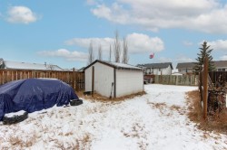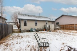 Situated in the growing community of Blackfalds, this property offers a solid opportunity for first time buyers or investors looking to build equity. Located close to parks, playgrounds, walking paths, schools, shopping, and the Eagle Builders Centre, this bungalow sits in a convenient, well established neighbourhood. The main floor features hardwood flooring, vaulted ceilings, and an open concept layout that provides a bright and functional living space. The kitchen offers oak cabinetry and ample storage, and the adjacent dining area flows comfortably into the living room. Two bedrooms are on the main level include a nicely sized primary suite with a walk-in closet. A full 4-piece bathroom completes the main floor. The basement is partially finished to the drywall stage, giving you a head start on creating additional living space. Two framed and drywalled bedrooms are in place, along with a laundry room and a rough-in for a future bathroom, offering flexibility for renovation or investment purposes. Outside, the large backyard provides plenty of room to add a detached garage with back alley access, and the space is partially fenced for added privacy. A hot water tank replaced approximately two years ago adds value and peace of mind.