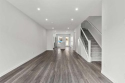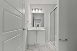 Ambrosia at ZEN Livingston – Offering 1,086 sq ft of thoughtfully designed living space, this 2 BED, 2.5 bath home features TRIPLE-PANE windows, advanced insulation, and a rough-in for solar panels. The OPEN CONCEPT main floor showcases Cicero Luxury VINYL PLANK flooring, pot lights with knock-down ceilings, and a BRIGHT LIVING AND DINING area that flows into your BACKYARD that is FULLY FENCED, perfect for those with kids, pets or wanting to enjoy some privacy - complete with BBQ GAS LINE, landscaping, and irrigation. The modern kitchen features white QUARTZ COUNTERTOPS and a 6-piece Whirlpool appliance package. Upstairs, you'll find two spacious bedrooms including a primary bedroom with an ensuite bathroom, and upstairs laundry. Enjoy HARDIE BOARD siding (hail/fire-resistant), and be part of a vibrant community just steps from the Livingston Hub with splash park, rink, courts & more!. Photos are representative.