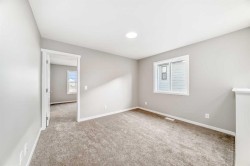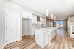 Welcome to this brand-new “Rayn” in Mahogany—a home that blends stylish family living with future flexibility. A separate side entrance offers the option for a private lower-level development or suite down the road (A secondary suite would be subject to approval and permitting by the city/municipality), while the main floor is designed for everyday ease with warm, natural luxury vinyl plank and clean, modern finishes throughout. At the heart of the home, the central kitchen shines with timeless white cabinetry raised to the bulkhead, bright white quartz countertops, and a white marble-style backsplash that wraps the stand-alone chimney hood fan for a seamless, upscale look. Stainless steel appliances and an oversized island make meal prep and casual entertaining effortless. The dining area sits perfectly between kitchen and living—roomy enough for an extended table—while the rear living room enjoys floor-to-ceiling windows and a smart back entry with a 2-piece bath. Just off the kitchen, a versatile flex room adapts to your life (home office, play space, fitness corner), and a raised homework/tech nook overlooks the main floor—organized, functional, and surprisingly fun. Upstairs, a cozy bonus room anchors the level for movie nights or quiet reading. The primary retreat is tucked at the back with an oversized window, a generous walk-in closet, and a chic 4-piece ensuite featuring dual sinks and a full-size shower—finishes you’d expect in a much larger home. Two additional bedrooms are well-proportioned, and the upstairs laundry and linen storage keep day-to-day living simple and tidy. Live the four-season lake lifestyle Mahogany is known for. Centered around Calgary’s largest freshwater lake and a 21-acre beachfront, the community offers private resident beaches, swimming, skating, and year-round events. Stroll the scenic wetlands and extensive pathway network, or head to the Urban Village for coffee shops, restaurants, services, and everyday conveniences. Families appreciate nearby schools and playgrounds; commuters value quick access to Stoney Trail, Deerfoot Trail, and the Seton District’s amenities (South Health Campus, shops, dining, and recreation). Mahogany pairs resort-style living with real-world convenience—making home feel like a getaway, every day.