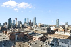 Experience elevated downtown living in this stunning 16th-floor residence at the iconic Arriva Tower. Spanning 1,367 sq. ft., this bright and airy corner unit offers 2 bedrooms, 2 bathrooms, and uninterrupted east facing views through floor to ceiling windows that capture the morning light and stretch across the city skyline and Bow River valley. The orientation provides an incredible sense of privacy and tranquility, paired with sweeping, ever changing vistas.The contemporary kitchen is a showpiece, featuring a full Miele appliance package, gas cooktop, sleek cabinetry, and an expansive island that anchors the open concept layout. Stunning engineered hardwood floors flow throughout the main living spaces, creating warmth and sophistication against the modern design.The spacious living and dining areas are perfect for entertaining or simply relaxing while taking in the panoramic views. The primary suite is a true retreat, complete with a walk-through closet and spa-inspired ensuite featuring a deep soaker tub and glass-enclosed shower. A generous second bedroom and full bathroom offer flexibility for guests or a home office.This home includes two titled underground parking stalls, an assigned storage locker, central air conditioning, and high speed elevators for quick, private access.Known for its luxury living and exceptional service, the Arriva Tower offers a full time concierge who also accepts parcel deliveries, a convenient bonus for residents. Additional building features include 24-hour security, two guest suites, an owner’s lounge and event room, and a beautifully maintained fourth floor courtyard terrace with BBQ area for outdoor relaxation.Located in the vibrant Beltline, steps from the Stampede Grounds, future Event Centre, C-Train access, and Calgary’s best restaurants and entertainment.