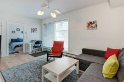 Welcome to a place in University District - award winning and mindfully made urban community that combines residential, retail, office, shopping, dining and entertainment. This is a modern and sophisticated 1 bedroom, 1 bath condo with titled parking space and lovely courtyard views. The family room is spacious enough for hosting togethers with family and friends and is a great place to unwind and watch a movie or see your team play games. There is enough space in this room for a desk and has glass sliding doors to the large outdoor deck with courtyard views. The spacious kitchen showcases quartz counters, sleek ceiling height, an integrated panel covered refrigerator and a premium energy saving stainless steel appliance package. The convenient breakfast bar is located beside the privacy panel separating the kitchen and the family room. Space saving barn doors separate the living room from the generously sized primary bedroom. The 4-piece bathroom is highlighted with matching quartz counters. Additional upgrades include 9’ ceilings, in-suite laundry, high grade wide plank flooring, built in smoke detectors, in-suite sprinklers, a security system and more. There is a titled underground and heated parking stall for convenience. Located only a few steps away from the hub of University District is retail main street with popular retailers like Monogram Coffee, Five Guys Burgers, Village Ice Cream, Canadian Brewhouse, OEB Breakfast, Cineplex Theatre, Save on Foods, YYC Cycle and more! Surrounded by parks, bike trails, easy access to the University of Calgary, Alberta Children's Hospital, Foothills Hospital, Market Mall, City Center, and Bow River Path systems. Study, shop, sip, sweat, get social - this place has something for everyone. Check the virtual tour and visit this amazing place!