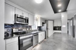 Welcome to Greenwood Village. Beautiful, completely renovated in 2021, 3 bed, 2 bath, 1160 sf mobile home in this NW amenities-rich community. This immaculately maintained home that shows like new is truly move-in ready. Laminate flooring throughout, white shaker-style kitchen cupboards, tiled backsplash, stainless steel appliances, coffee bar, and corner pantry, large kitchen island with pot lights, and a good size eating nook complete the kitchen area. Also in 2021 NEW WINDOWS, NEW FURNACE, All POLY B replaced with PEX, and newer roof. Electrical Panel – 2021 Baseboard and casing - 2021. 4 PCE ENSUITE has walk-in shower with tiled seat and awesome massage shower system. This great home has a huge sunken living room with black accent beams in the vaulted ceiling, and a step up to the kitchen and eating area. Separate laundry and furnace room can be found at the rear exit. The large master bedroom could easily fit a king bed, has a wall to wall closet with glass doors, and a black metal siding door that leads to the huge, fully tiled ensuite with a double sink vanity and walk in shower. Newer lighting, painted throughout in a modern palette, with a bright and airy feel. At the opposite end of the home are two additional bedrooms, the full bathroom, a nice entry with coat closet all makes this a great, functional floorplan. Add a carport, parking for two cars, a fenced backyard and a shed are all value-added items that round out this home to be terrific value! Located next to Greenwich Village, home of the famous Farmers Market West. This home is ideally located near Stoney Trail Ring Road for effortless citywide travel, and Highway 1 for a weekend getaway to Banff or Bragg Creek. Lease fee of $1375 monthly includes water, sewer, garbage pick up & snow removal. Calgary Transit and a school bus offers service through the park. Lease approval required, pets allowed.