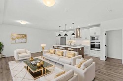 Welcome to elevated condo living—where refined design, thoughtful upgrades, and everyday comfort come together seamlessly. This impeccably maintained end-unit residence is filled with natural light, framed by 9-foot ceilings and expansive south- and east-facing windows that create an airy, upscale atmosphere throughout.The upgraded kitchen is a true showpiece, featuring quartz countertops, extended 41-inch upper cabinetry, and a striking oversized island designed for both entertaining and effortless daily living. Luxury vinyl plank flooring flows throughout the home, connecting the generous dining area to a spacious living room that’s perfect for hosting or unwinding in style. Convenient in-suite laundry adds to the home’s functional appeal.The primary suite is a private retreat, offering a generous layout, an extra-large walk-in closet with custom organizer, and a spa-inspired 4-piece ensuite complete with a tiled shower and upgraded cabinetry. The second bedroom provides excellent flexibility, enhanced by a pocket door offering direct access to the main bathroom—ideal for guests or a home office setup.With over $27,000 in builder upgrades, this home stands apart. Motorized zebra blinds (throughout, excluding the second bedroom) and builder-installed air conditioning deliver both comfort and convenience year-round. Step back and take in the open views, all while being moments from shops, dining, and everyday amenities in a vibrant, well-connected community.The offering is completed by one of the largest heated underground parking stalls in the building, paired with spacious storage—a rare and valuable combination.This is modern condo living done right. Thoughtfully upgraded, beautifully finished, and perfectly located—an exceptional opportunity to own a home that truly delivers on lifestyle and quality.