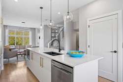 Welcome to effortless luxury in the community of Springbank Hill. This modern three-storey townhome offers over 2,500 sq ft of thoughtfully designed living space, perfectly blending style, comfort, and everyday function.Perched at the top of the hill, this home enjoys incredible views—sunsets over the Rocky Mountains to the west and a tranquil greenspace backdrop. With an east-west orientation and oversized windows, natural light floods every level, creating a warm and inviting atmosphere throughout the day.The main floor makes a striking first impression with 9’ ceilings, luxury vinyl plank flooring, and designer lighting. The open-concept kitchen features stainless steel appliances—including a gas range—sleek quartz counters, and direct access to the dining area. Just beyond, a generous deck with elegant glass railings extends your living space outdoors, perfect for morning coffee or relaxed dinners with a view.Upstairs, the primary suite offers a private 4-piece ensuite and a large walk-in closet. Two additional bedrooms share a full bathroom and convenient upper laundry, making this level ideal for family living.The fully finished walkout level is designed for entertaining and relaxation, complete with a large rec/media room that opens to a covered lower deck of over 400 sq ft, framed with glass railings to maximize the surrounding natural views. A flexible den and third full bathroom complete this level, offering space for guests or a home office.Additional highlights include an oversized heated garage, a private elevator servicing all levels, and turnkey convenience that supports both an active lifestyle today and the ability to “age in place” tomorrow. All of this, just minutes from shops, great restaurants, schools, and everyday amenities—with quick access to Stoney Trail for a seamless commute downtown or an easy escape to the mountains.This is executive living in Springbank Hill—sophisticated, functional, and designed for the way you want to live.