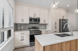 Welcome to this beautifully crafted 3-storey townhome where sophisticated design, smart layout, and upscale finishes come together to create the perfect home in one of Calgary’s most desirable communities, Sage Hill. From the moment you arrive, the eye-catching stucco and stone exterior with bold black-clad windows make a lasting impression. Step inside and experience 9-foot ceilings on all 3 levels, flooding the home with natural light and enhancing the open and spacious feel. The ground level offers incredible versatility with a separate entrance to a private bedroom and full bathroom perfect for guests, a home office, or multi-generational living. You’ll also find the spacious attached single-car garage and utility room on this floor. On the main floor, the heart of the home comes alive with an open-concept layout that’s perfect for entertaining. The professionally designed kitchen features sleek cabinetry, black hardware, pantry, stainless steel appliances and ample counter space, all overlooking the bright living and dining areas. A stylish powder room completes the main floor. Upstairs, retreat to two generously sized bedrooms, each with its own private ensuite. The primary suite is a true sanctuary, boasting comfort-height vanity, a walk-in custom-tiled shower. Every detail in this home has been thoughtfully chosen, including pot lights, upgraded finishes, and 3.5 beautifully appointed bathrooms. Whether you’re a first-time buyer, growing family, or an investor, this home offers exceptional value. This vibrant location offers CONVENIENT ACCESS to daily essentials including schools, restaurants, shopping and transit. Walmart Supercentre (4 mins), Kenneth D. Taylor School (6 mins), Valley Creek School (9 mins), SB Sage Hill GD Bus Stop (3mins), Crowfoot LRT Station (14mins), T&T Supermarket Sage Hill (6 mins), Costco Wholesale (10 mins), Walk-in Clinic at Walmart by Jack Nathan Health (5 mins), Kincora Glen Park (5 mins), Symons Valley Fire Station (6 mins), to name a few. Thinking luxury, lifestyle, and location, this is the one you’ve been waiting for. Contact us today to schedule a viewing!