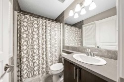Welcome to this immaculate, air-conditioned 3-bedroom (4th if you count the partially finished basement), 3-bath home located across from a school and playground!Step inside to discover a bright, contemporary open-concept layout with large windows that fill the space with natural light. Beautiful hardwood floors flow seamlessly through the spacious living room, featuring a cozy three-sided fireplace, and into the kitchen and dining area.The modern kitchen offers stylish cabinetry, stainless steel appliances, ample storage, and a large center island — perfect for meal prep or entertaining guests. A convenient rear entrance and a half bath complete the main level.Upstairs, you’ll find three generous bedrooms, including a spacious primary suite with a walk-in closet and a private 4-piece ensuite. A second 4-piece bath serves the additional bedrooms.The basement has been professionally framed and wired to the drywall stage by a journeyman electrician (with permits). It features thoughtfully placed recessed lighting, outlets, and switches, plus egress windows and a 3-piece rough-in — offering an excellent opportunity to add value and create the lower level of your dreams.Outside, enjoy the 22’ x 20’ detached garage with access from a clean, paved laneway.Location highlights:• Steps away from a school, playground, and bus stop• Short stroll to two nearby schools and scenic ridge pathways for evening walks - A Fantastic Hall/ Rec Center including a splash park and outdoor rink• Just minutes to South Health Campus, Sobeys, and a variety of shopping and dining optionsPride of ownership is evident throughout — this home is move-in ready and waiting for you! Don’t miss your chance to make it yours. Book your showing today!