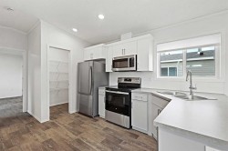 Affordable living plus home ownership at its best! No shared walls! No one living above or below you! No Special Assessments! Extra space! Your own private yard for kids and pets! Grow a garden! Guests are allowed! Community amenities included! This incredible home has so many more benefits than living in a condo or rental. This brand new manufactured home (16' x 68') by Triple M in Lethbridge, is a great lifestyle for anyone that wants more than most condos can offer and at a cost that is comparable to renting. 3 bedrooms and 2 bathrooms in 1,062 square feet are on 1 level. The large primary suite has a walk-in closet and 4 piece ensuite bath. New, stainless steel appliances and vinyl plank flooring in the open concept kitchen, dining and living room. 2 more bedrooms for kids, guests or hobbies. Additional 4 piece bath plus separate laundry room included. Outside is a fenced yard with a huge deck waiting for your summer afternoon barbeques. A 2 car parking pad is included on your own lot. No "assigned" parking here. There is more. The clubhouse (2 minute walk away) includes a fitness room, games room with pool table, community kitchen and lounging area. This is a family friendly and pet friendly park with a kids playground, picnic tables and common barbeques. Come, be part of a community again! GST must be added to the purchase price, but the buyer is eligible to collect the GST rebate from CRA. Beyond the purchase price, all sites in the park rent for $1,299 per month which includes water, sewer, garbage removal and clubhouse amenities. The clubhouse offers a modern exercise room, a games room with pool table, common areas with large screen t.v., community kitchen, bbq's and children's playground. There are no additional costs for these amenities. Although this sounds high, it includes many amenities not available at other parks. You will find Calgary Village offers the most spacious lots with room for double parking (in most cases) plus storage sheds, etc. Many residents have built fences, decks and other features that are not allowed in other parks. This is a family friendly and pet friendly community. There is no size restriction on dogs, but a limit of two pets per home. When you consider that many condominium projects are experiencing double digit cost increases and special assessments, this is still the most economical option for home ownership.
