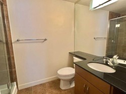 Presenting the largest corner unit in the building—an exceptional 2-bedroom, 2-bathroom residence offering 1,038 square feet of thoughtfully designed living space. This upgraded residence features stylish engineered hardwood flooring and an open concept floor plan. A spacious and welcoming foyer with a double closet sets a sophisticated tone upon entry. Expansive windows throughout the unit allow for an abundance of natural light, further enhanced by the addition of elegant, customized double-layer curtains that provide both privacy and light control. The modernized kitchen is outfitted with updated cabinetry and striking black granite countertops, complemented by a suite of matching black appliances. The generous living room offers ample space for comfortable seating arrangements, with an adjacent dining area that opens to a private balcony featuring pleasant views. The primary bedroom includes a well-appointed four-piece ensuite, adding to the home's overall functionality and comfort. Residents will appreciate the building’s direct access to essential amenities, including nearby grocery stores and restaurants, all reachable without the need for elevator use. A convenient door one level below provides quick, weather-free access to Save-On-Foods via the 4th-floor parkade. Additional features include on-site security, a dedicated concierge, and ample indoor and guest parking. Situated in a highly desirable location within walking distance of numerous services and conveniences, this professionally upgraded unit with a sought-after layout represents exceptional value in today’s market.