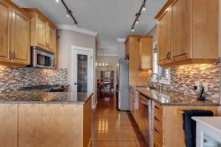 RARE OPPORTUNITY to own this immaculate 55+ walkout bungalow-style villa backing directly onto greenspace—with no neighbours behind! Tucked into one of the best locations in the community, this home is ideal for empty nesters and downsizers seeking a low-maintenance lifestyle without sacrificing space or comfort. From the moment you step inside, you’ll notice the executive upgrades including 9’ ceilings, custom crown moulding, and hardwood flooring throughout the main level. The layout is bright and functional with a spacious tiled front entry, a front den/office with large windows, and a formal dining area perfect for hosting. The kitchen offers granite countertops, corner pantry, an updated tile backsplash, and newer stainless-steel appliances including a fridge with water and ice, dishwasher, and microwave hood fan. The adjacent eating nook showcases unobstructed greenspace views and leads to the deck—a perfect spot for morning coffee or quiet evenings outdoors. The living room is warm and inviting and includes a three-way fireplace. The primary suite is a great size and features a walk-in closet and a beautifully updated ensuite with heated floors, a tiled shower and Jacuzzi tub. The main level is complete with a powder room and convenient laundry with new washer and dryer (2024). Downstairs, the walkout lower level expands your living space with a large family room featuring a gas fireplace, built-ins, a spacious additional bedroom, and a full bathroom. There’s also a versatile room that is ideal for an office, hobby space, rec room, or potentially an additional bedroom plus plenty of storage. Additional highlights include air conditioning, and a central vacuum system. Best of all: no condo fees—just a low $180 HOA fee covering lawn care, snow removal, and irrigation, making this an ideal turn-key option for those looking to simplify and enjoy life. With easy access to Stoney Trail, shopping and amenities this move in ready villa is not to be missed!
