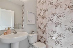 Westcreek Home presents the Cascade plan offering a perfect blend of style and functionality, starting with a charming front porch with stone accent exterior. Step inside to a spacious front lifestyle room featuring 9’ knockdown ceilings and durable vinyl plank flooring. The center dining area flows seamlessly into a beautifully appointed rear kitchen, complete with quartz countertops, extended height white cabinets with upper soffit fillers, a striking chimney hood fan, and a tiled backsplash. A gas line rough-in to the stove adds convenience for cooking enthusiasts. Additional features include a rear entry with a closet, a 2-piece bath, and a dual-door pantry closet for ample storage. Upstairs, plush carpeting enhances comfort in the two front bedrooms and hallway, while the rear primary suite boasts vinyl plank flooring in the 4-piece bath and a generous walk-in closet. The bath is elegantly finished with a quartz storage vanity and a tub surround accented with decorative tile. A dual-door upper laundry room with built-in upper storage cabinets adds practicality. Another 4-piece bath with vinyl plank flooring, quartz vanity and tiled tub surround serves the upper level. A linen closet completes the upper floor. The basement offers a separate side entry and is ready for your personal touch, featuring 9’ ceilings and rough-ins for a bath and kitchen, providing excellent potential for future development. Experience this amazing plan, community with unique options to make this your smart investment!