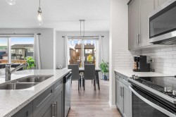FORMER SHOWHOME | GEMSTONE LIGHTS | TRIPLE PANE WINDOWS | OVERSIZED GARAGE | BUILT IN SPEAKERS | CENTRAL A/C. Welcome to this exceptional former showhome in the vibrant community of BELMONT, where THOUGHTFUL DESIGN meets EVERYDAY LUXURY. From the moment you arrive, this home stands out with its CUSTOM GEMSTONE LIGHTING and OVERSIZED GARAGE, perfect for larger vehicles or extra storage. Step inside to discover a BRIGHT OPEN CONCEPT MAIN FLOOR with WIDE PLANK VINYL FLOORING, HIGH 9 FT CEILINGS, an inviting LIVING AREA WITH GAS FIREPLACE, and a CHEF’S KITCHEN equipped with QUARTZ COUNTERTOPS, STAINLESS STEEL APPLIANCES, a WALK IN PANTRY, and sleek CABINETRY. A SKYLIGHT ABOVE floods the space with natural light, enhancing the airy feel. Upstairs, you will find a SPACIOUS BONUS ROOM WITH HIGH CEILINGS, a serene PRIMARY SUITE WITH SPA INSPIRED 5 PIECE ENSUITE and WALK IN CLOSET, plus TWO MORE GENEROUS BEDROOMS and a conveniently located LAUNDRY ROOM. TRIPLE PANE WINDOWS throughout provide ENERGY EFFICIENCY and a WHISPER QUIET INTERIOR. The entire home is wired for sound with IN CEILING SPEAKERS and a HIGH END AMPLIFIER SYSTEM, ideal for entertaining or enjoying your favourite playlists in style. Stay cool in summer with CENTRAL AIR CONDITIONING and enjoy the MODERN ELEGANCE of every corner in this professionally designed space. The BASEMENT offers a blank canvas, ready for your custom vision with LARGE WINDOWS and PLUMBING ROUGH INS. This is the perfect blend of SHOWHOME QUALITY FINISHES and REAL WORLD FUNCTIONALITY in one of Calgary’s most desirable communities.