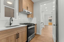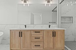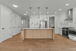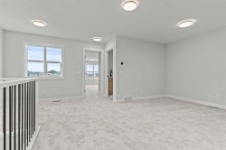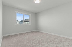 Welcome to 263 Kinniburgh Loop, a truly exceptional luxury home offering 2,457 sq. ft. of beautifully designed living space, featuring 4 bedrooms and 3 full bathrooms, thoughtfully crafted for both everyday living and entertaining. From the moment you arrive, you’re welcomed by an impressive oversized front door and a spacious, open entry that immediately sets the tone for the quality found throughout the home. Just off the foyer is a large main-floor bedroom or office, conveniently connected to a full bathroom with a standing shower—ideal for guests or multigenerational living.As you move further into the home, you’ll be captivated by the stunning chef’s kitchen featuring a nearly 9-foot island, quartz countertops, stainless steel appliances, full-height cabinetry, and high-end luxury finishes. The main floor is completed by a spacious living room with an electric fireplace, dining area, spice kitchen, and a walk-through mudroom with direct access to the garage. Everyday convenience is elevated with three main-floor closets, including two in the kitchen and one in the mudroom.Upstairs, a generous bonus room and sitting area create the perfect secondary living space. The expansive primary bedroom offers breathtaking pond views and connects to a spa-inspired 5-piece ensuite featuring dual vanities, a large glass shower with mosaic tile base, a freestanding tub, and a private toilet room. The primary flows seamlessly back into the laundry room, which also offers access back to the bonus room for added functionality. The upper level is completed by two additional large bedrooms and another beautifully finished 5-piece bathroom, with no dropped beams on the main or upper floors for a clean, open feel.This home includes all of the renowned Golden Homes standards, such as true 9-foot ceilings on the main floor, triple-pane windows, side entry, matte black iron spindle railings, matte black hardware and fixtures, built-in shelving in the pantry and primary walk-in closet, upgraded carpet underlay, a tankless hot water heater, smart home features, gas lines to both the deck and garage, and a solar panel rough-in. The exterior is fully landscaped with the lot graded and loamed, sod installed to the side entry, and a front yard tree—completing this luxury home in one of Chestermere’s most desirable communities.