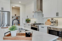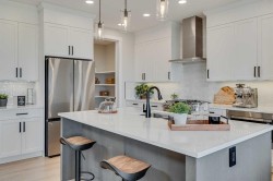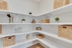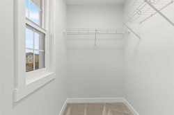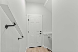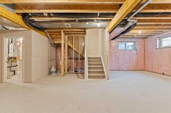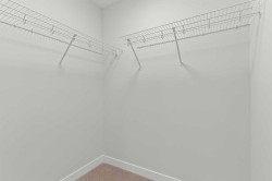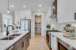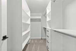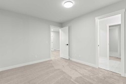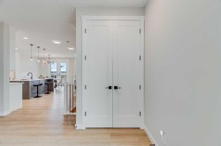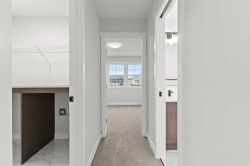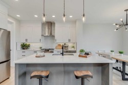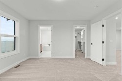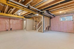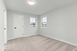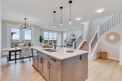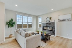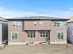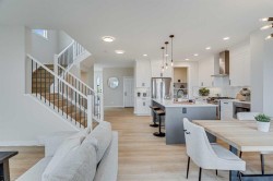 This beautifully designed 2134 SQFT semi-detached home, built by 5-star builder Golden Homes, sits on a conventional lot with an oversized double car front-attached garage, offering the perfect combination of functionality and modern craftsmanship in one of Chestermere’s most desirable communities.The main floor welcomes you with 9-foot ceilings, 8-foot doors, and an open-concept layout that’s both spacious and practical. The heart of the main floor is the upgraded kitchen, featuring two-tone cabinetry—Chantilly Lace white perimeter cabinets and a light wood island—quartz countertops in the kitchen and throughout the home, soft-close drawers with metal sides, and upgraded Samsung stainless steel appliances. The main floor also features a built-in microwave with a luxury stainless steel trim and a walk-in pantry with built-in shelves, ideal for storing everything from food to small appliances and dishware.The main level continues with a large dining area filled with light from the oversized triple-pane windows, a cozy living room with an electric fireplace, and glass sliding doors that lead to your backyard. Additional highlights include a half bath, side entrance, and a finished staircase to the basement, offering endless future development opportunities. The basement is fully roughed-in and includes a separate mechanical room for added safety and convenience.Making your way upstairs, you’re greeted by an oversized staircase with iron spindle railings and an open-to-below feature that adds even more space and light. The primary bedroom offers luxury finishings with a 5-piece ensuite, showcasing a fully tiled shower with glass doors, freestanding tub, double vanity, and a private enclosed toilet. The walk-in closet is custom-designed with built-in drawers and shelving.Two additional bedrooms each have their own walk-in closets and share a well-designed Jack & Jill bathroom with a double vanity and a separated toilet/shower space—perfect for daily convenience. The upper level also includes a laundry room with quartz countertop and shelving.Located in the family-friendly neighborhood of Kinniburgh South, this is your opportunity to own a brand new, thoughtfully upgraded home close to schools, parks, and everyday amenities an be part of the Golden Homes family! Pictures of same model. Selection specification are subject to change.